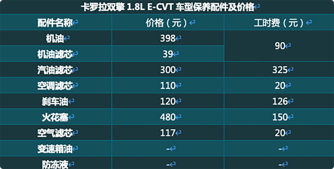 我们再看卡罗拉的配件价格,以及保养里程/项目,如下: