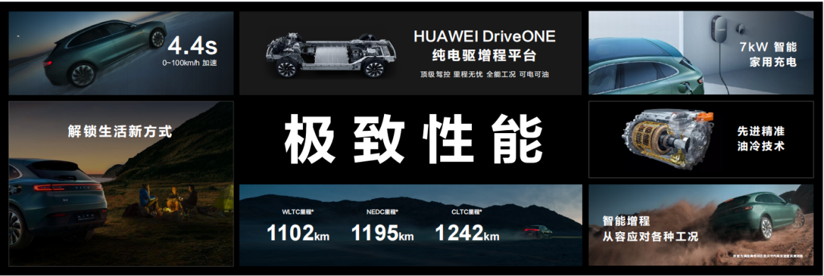 AITO问界M5全系搭载HUAWEI DriveONE纯电驱增程平台,WLTC可达1000km+,可在很大程度上解决补能焦虑问题,其中纯电续航150km,基本满足一天通勤需要。采用前异步交流电机+后永磁同步电机组成智能四驱组合,四驱旗舰版总功率365kW,0-100km/h加速4.4秒,5种驾驶模式、3种增程模式、4档回收力度自由调节,满足不同用户对于驾控细节体验的追求。
