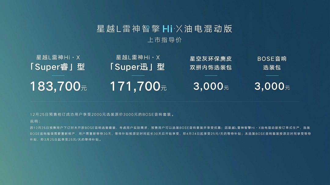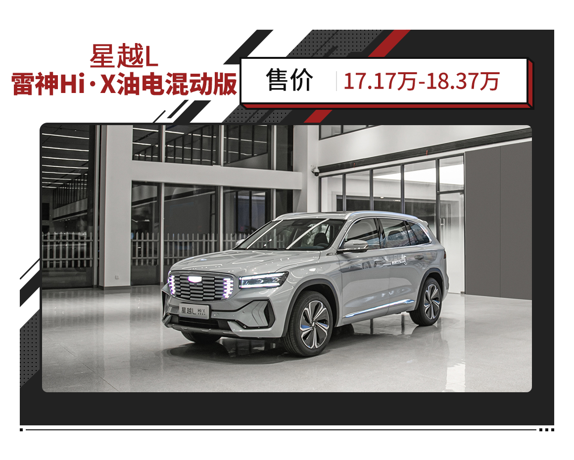 星越L雷神Hi·X油电混动版公布官方指导价格为17.17-18.37万。官方还提供了星空灰环保麂皮双拼内饰选装包和BOSE音响选装包以供选择。
