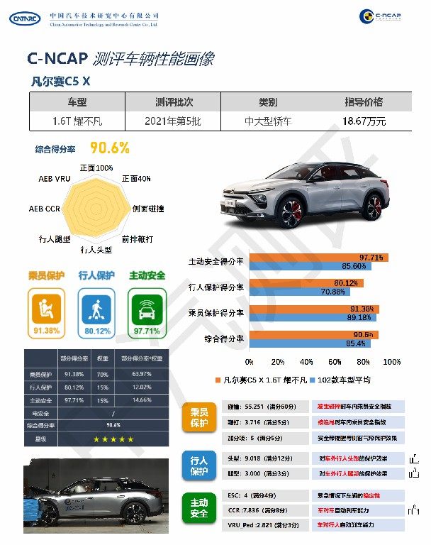 结合各部分得分率乘以各自权重系数后求和,求得综合得分率为90.6%。因此,该车达到“五星级”标准。不禁让我们深思,凡尔赛C5 X值不值的选择?或者说,凡尔赛C5 X有没有那么好或是那么差?