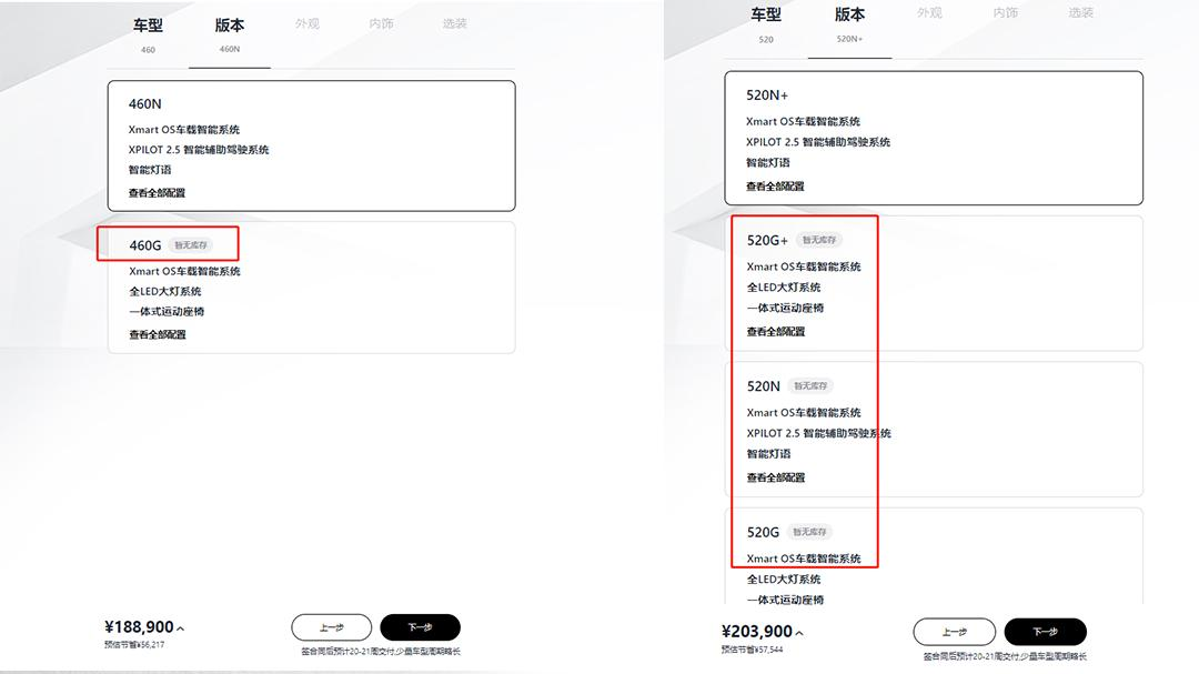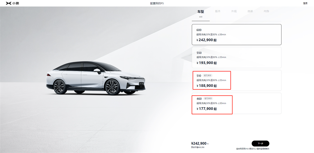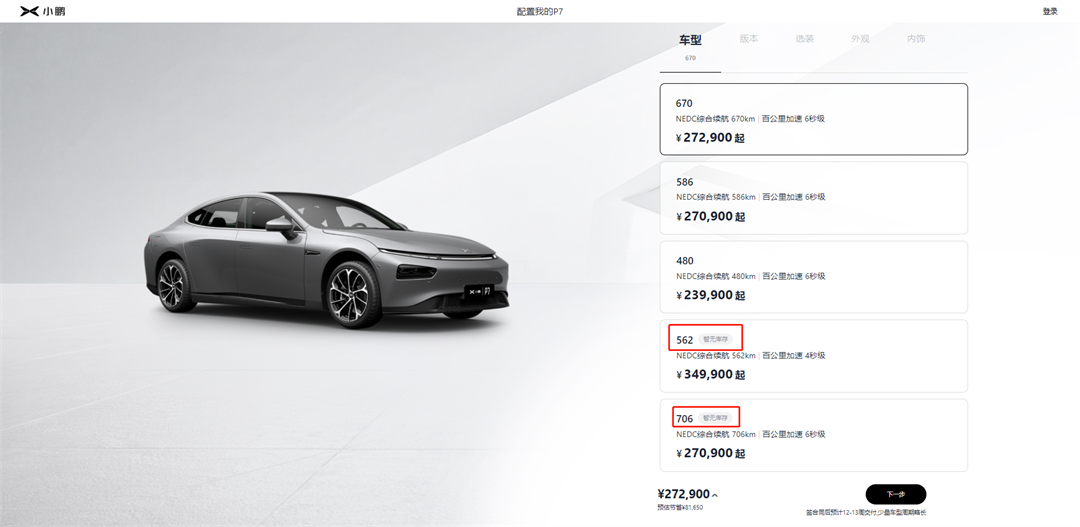 价格上调之后,小鹏P7当前指导售价为23.99-42.99万元,涨幅在1.01-3.26万。除了价格上调以外,目前只有480、586以及670版本可接受下订,其余的562以及706版本暂时不接受订单,显示暂无库存状态。