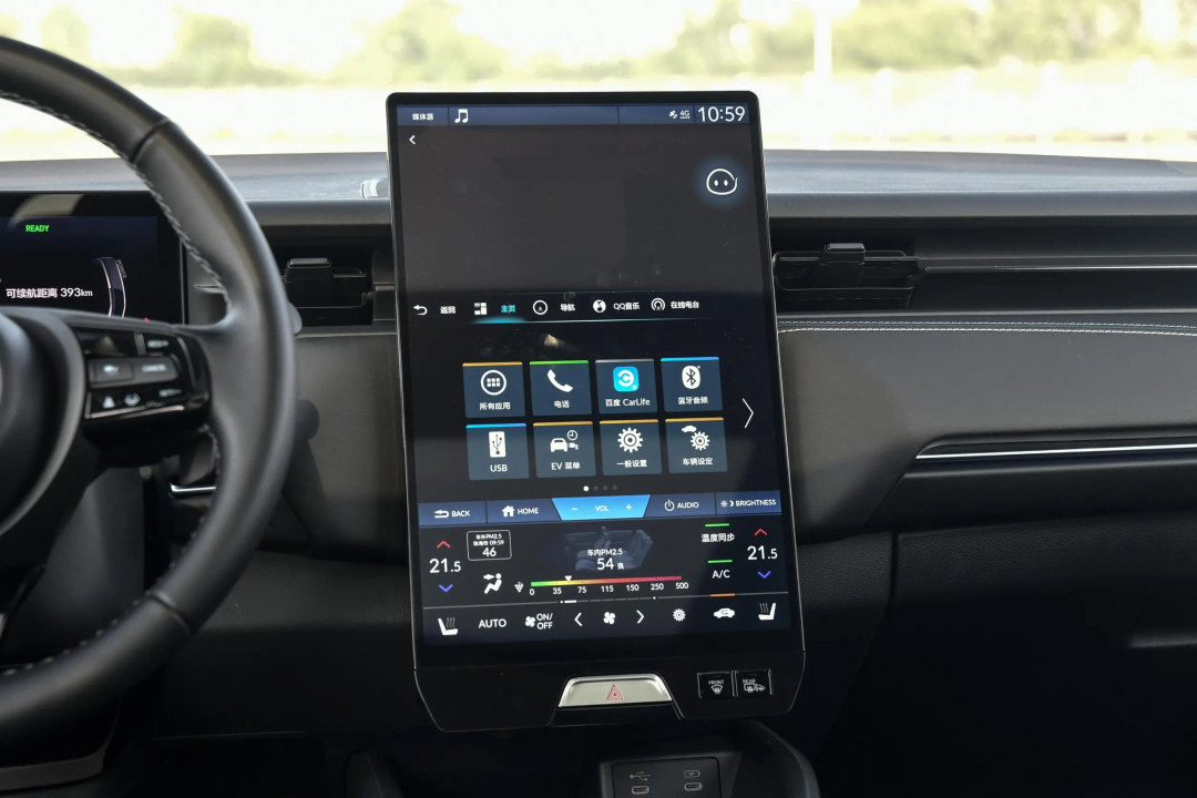 内饰部分,本田e:NS1同样采用全新的设计风格,与国内其他本田车型有很大不同,配备了非常小巧的10.25英寸全液晶仪表盘、精致的三幅式多功能方向盘以及夺目的15.2英寸竖置中控大屏,后者有点比亚迪的味道。