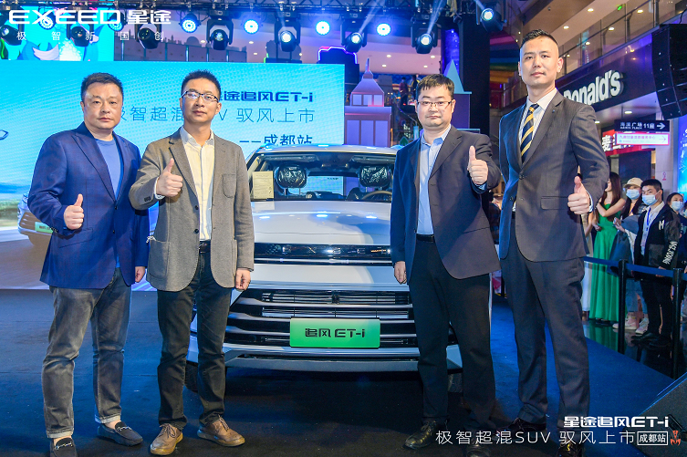 EXEED星途西南战区总监 薛晓斌先生、建国事业部总监 曹豇涛先生、成都亨孚总经理 邓鹏先生、成都瑞一东莲总经理 赵晨笛先生,为星途追风ET-i揭幕