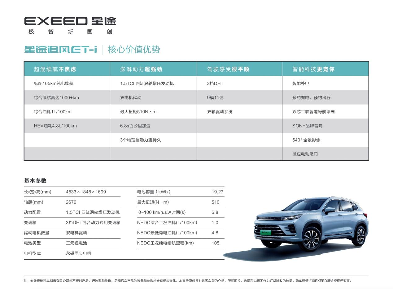 “超混续航不焦虑”——星途追风ET-i车型在续航以及油耗方面,星途追风ET-i凭借多场景下的最佳工况匹配,动力系统的最高传递效率可达97.6%。同时采用了更多在高端车型上才会配备的CRBS能量回收系统,在减速制动时,可以实现能量再回收,节能高效。从而实现了NEDC工况电驱动平均效率>90%,标准版纯电续驶里程可达105km,综合续驶里程超过1000km的优异续航表现。在油耗方面,星途追风ET-i的表现尤其抢眼,综合油耗可以达到1L/100km,馈电油耗可达4.8L/100km,让消费者在尽享强动力、长续航优势的同时,还能保持极低的用车成本。