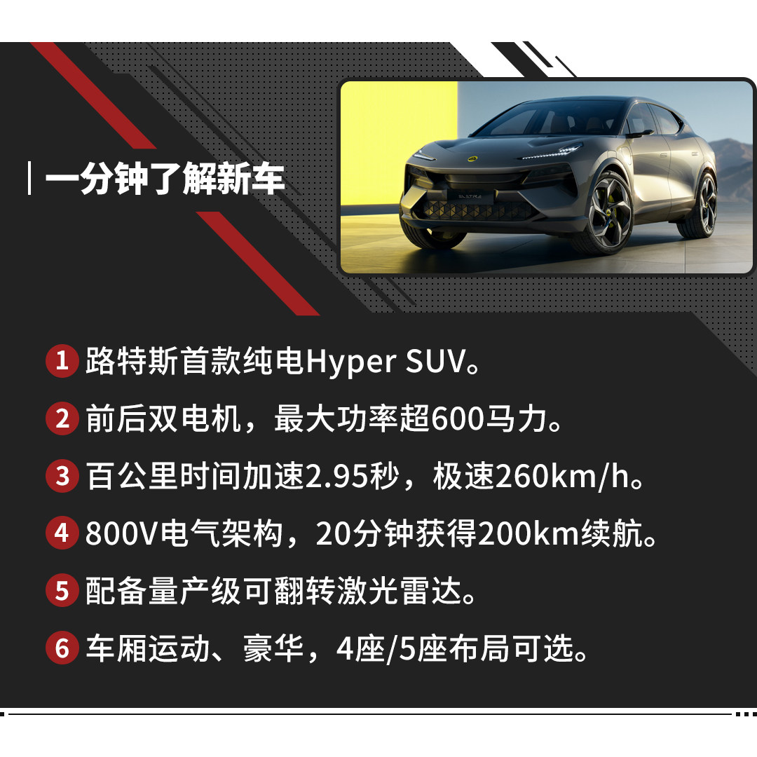 作为路特斯第一款纯电动SUV,ELETRE性能同样是“怪兽”级,搭载最大功率超600马力的前后双电机四驱系统,百公里加速时间只要2.95秒,并且极速可达260km/h,WLTP续航达到了足足600km,不仅跑得快还跑得远。