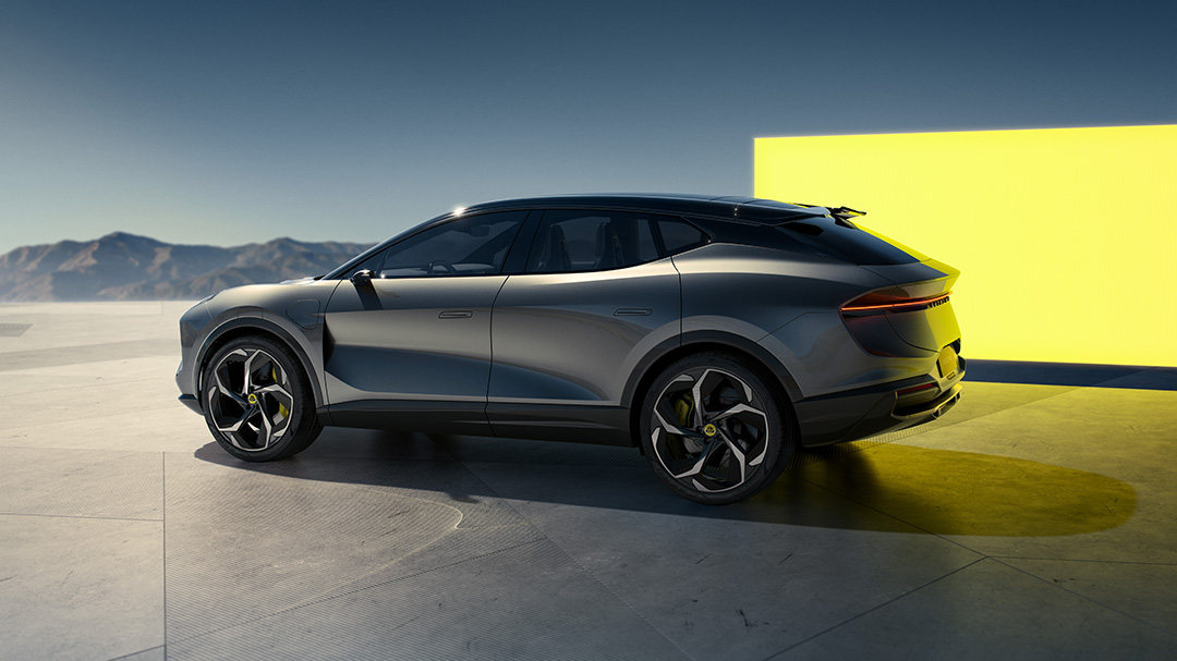 看向路特斯ELETRE侧部,它没有因为大尺寸而显得臃肿,溜背式车顶能够很好缓解SUV所带来的视觉厚重感,更别说它还有简约而不失凌厉的腰线。