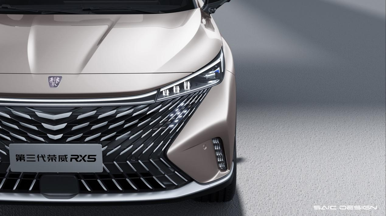 仔细观看,全新第三代荣威RX5的外观细节设计,也在着力强调着其“宽体”、“豪华”特质。前脸所采用的“凤凰”造型设计,通过片片相连的凤羽组合成大面积的X型格栅,不仅提升了整车的豪华氛围,也为车头烘托出了宽大的视觉效果;配合似朝阳天际线般的贯穿式前大灯,通过格栅上缘灯带相连,用贯穿车头的横向纵深感,进一步在视觉层面,对前脸起到了拉伸效果。