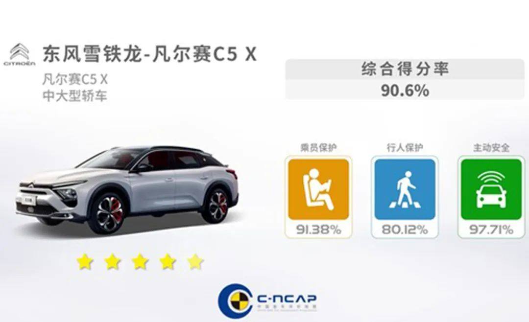 而在这一系列的项目中,凡尔赛C5 X都表现良好,最后以90.6%的综合得分率,稳稳地获得了C-NCAP五星安全评级。