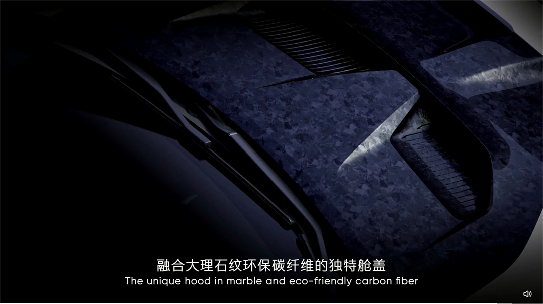 与此同时它的机盖部分采用了独特的大理石纹理的环保碳纤维机盖设计,使得车头部分显得更别具一格。