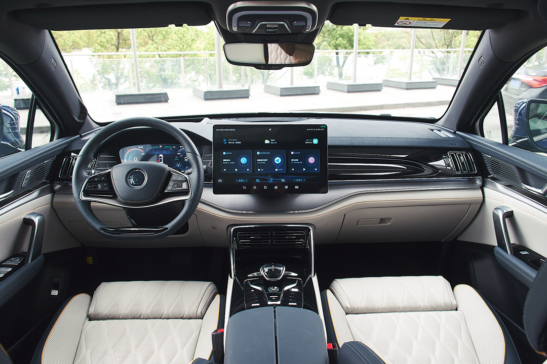 “苍穹灰”内饰配色方案由黑色、灰白色包覆材料以及橙色缝线搭配而成;相比于旧款车型以黑色、深棕色为主的配色方案,“苍穹灰”配色显然让唐EV的车厢显得更加明亮、洁净且时尚。