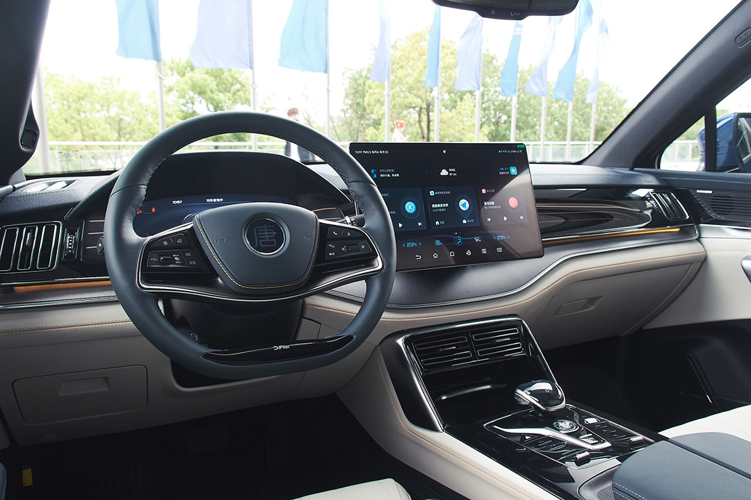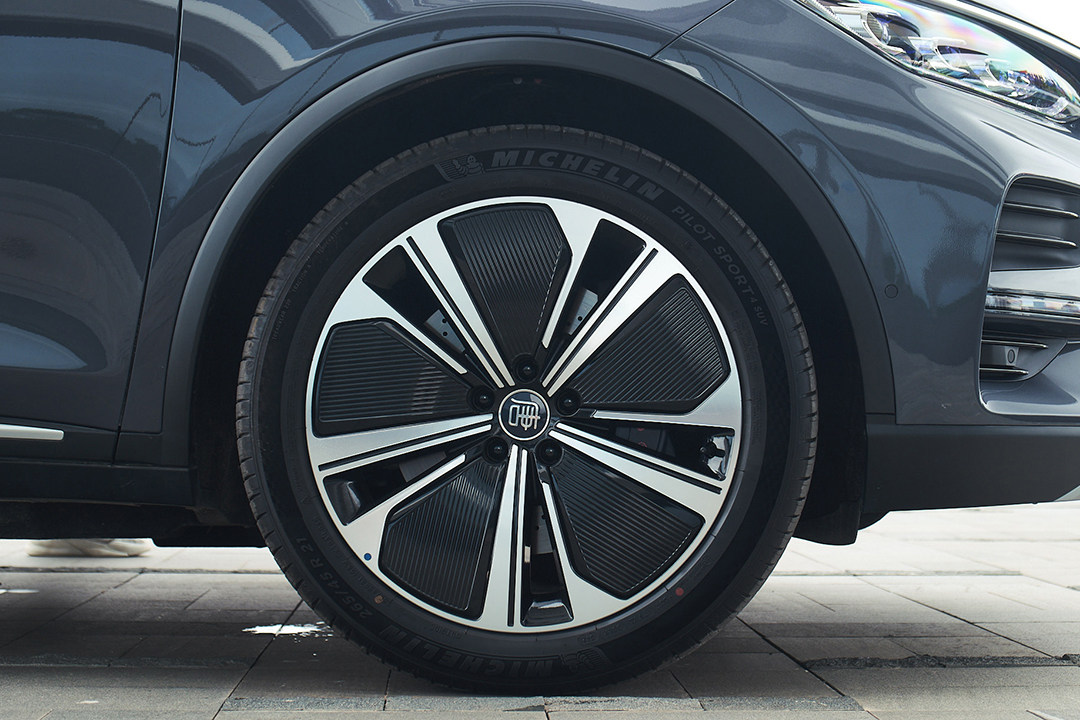 21英寸的超大轮毂也采用了全新的低阻设计,轮辐面积非常大;虽然将唐系列“键盘值”最高的Brembo刹车卡钳挡得严严实实,但配合着新增的极光蓝车漆,整台车看起来的感觉确实会更像“电动车”,极具辨识度。