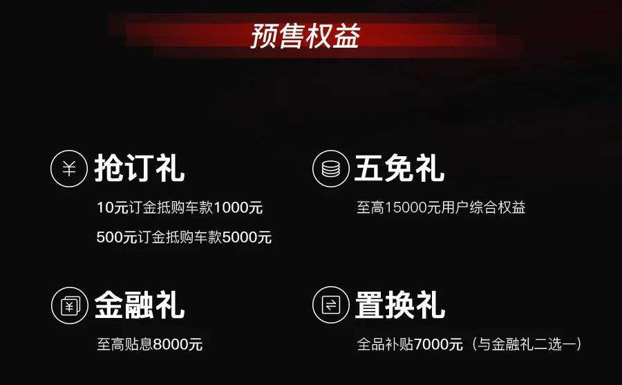 在新车预售期间,10元订金可抵购车款1000元,500元订金可抵购车款5000元,金融补贴最高有8000元,置换可享7000元的补贴(金融、置换礼二选一)。