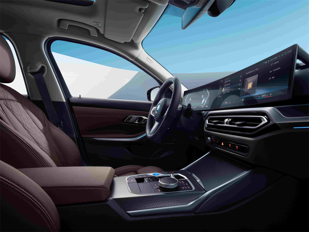 既然是3系纯电化产品,那么i3在科技上也要有进化。内饰最大亮点就是采用宝马iX同款的贯穿式悬浮曲面屏,集成了14.9英寸触控显示屏和12.3英寸数字仪表盘,传统挡把变成了拨杆,方向盘为M运动款式。