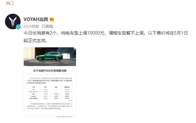 3月31日晚,岚图汽车正式公布了价格调整方案,旗下首款车型的岚图FREE纯电车型上调一万元,增程车型暂不上调,价格调整将在2022年5月1日0时起正式生效。调整后纯电动版本车型售价区间为34.36-37.36万元,增程式车型则不受影响。
