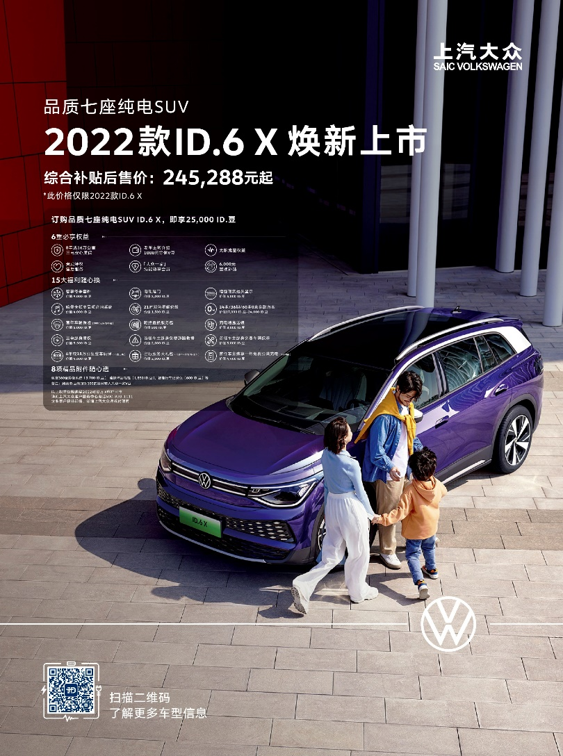 (2022年4月7日,上海)上汽大众2022款ID.6 X焕新上市,共提供6款车型,综合补贴后售价245,288元-335,888元。新车全系配备IQ. Drive智慧驾驶辅助系统、搭载智慧车联系统 4.0 升级版,并在安全、智能配置上有诸多升级。现订购2022款ID.6 X,即享25,000 ID.豆以及6重必享权益,另有15大福利及8项精品附件随心换购。