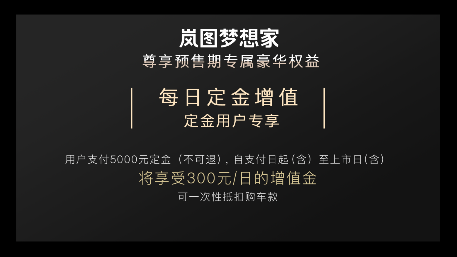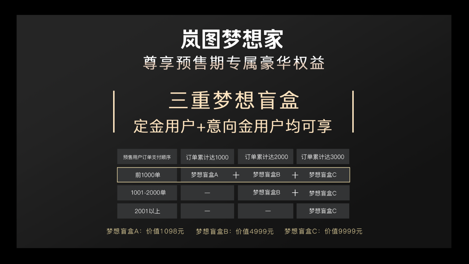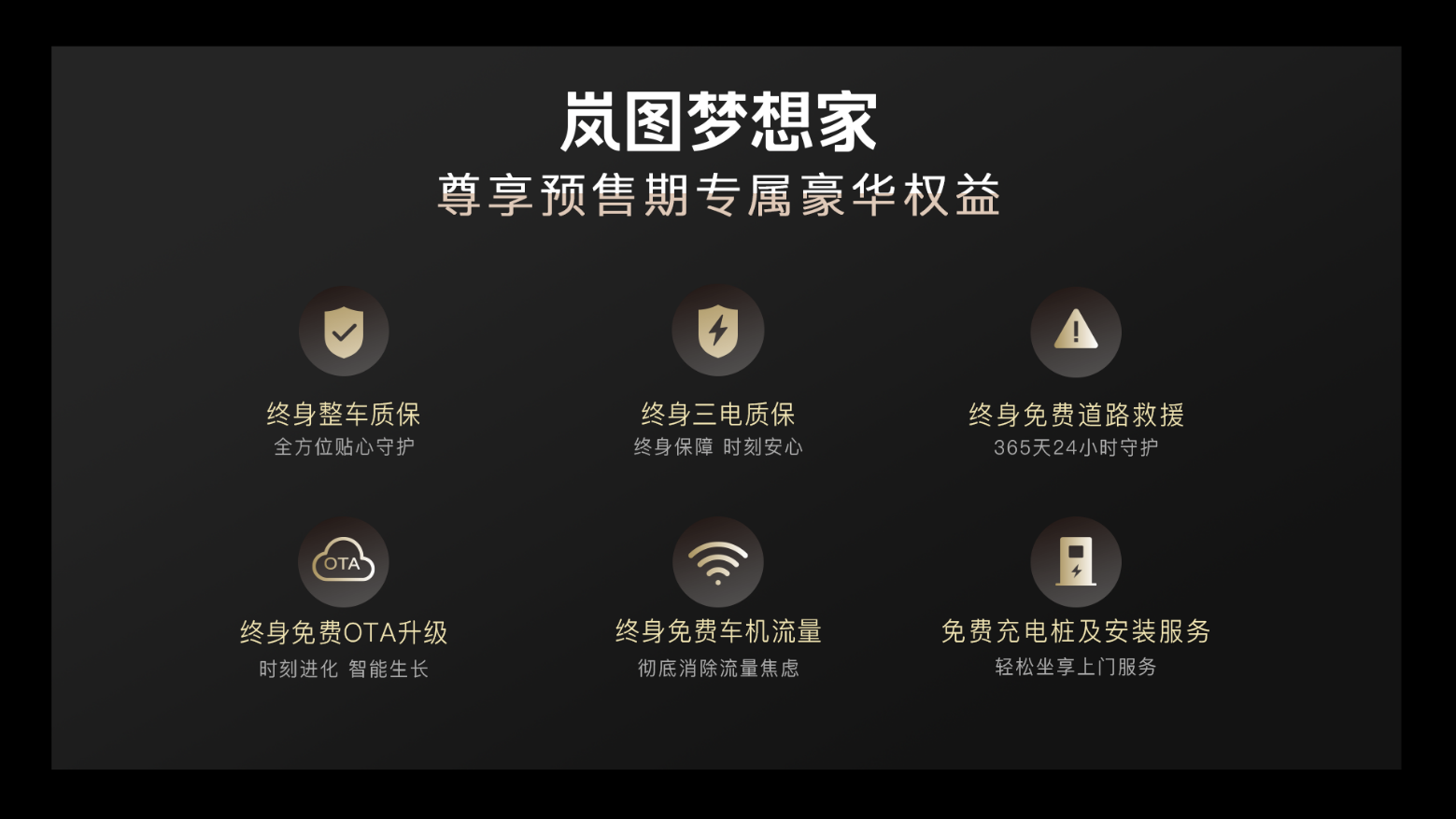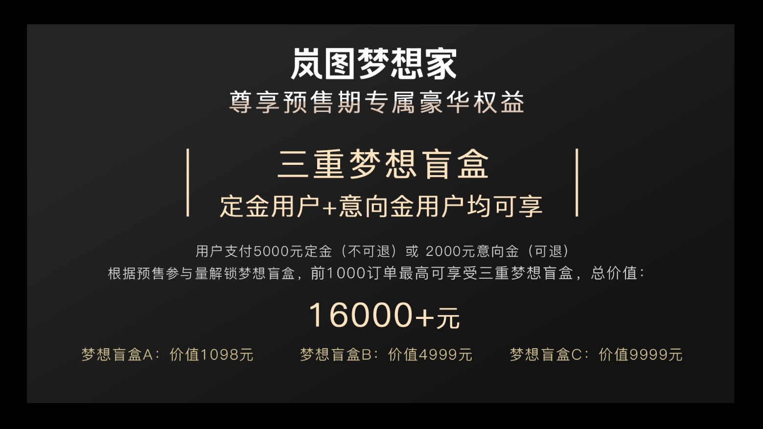 预售期间的预订用户,将可享有终身免费整车质保、终身免费三电质保、终身免费道路救援、终身免费车机流量、终身免费OTA升级、免费充电桩安装六大无忧服务权益。本次岚图梦想家的预售活动,岚图汽车还创新推出了两种不同模式的权益活动:支付5000元定金的用户,自支付日起(含)至上市之日(含),可享受每日300元增值金,交付时一次性抵扣购车款。支付5000元定金或2000元意向金的用户,根据订单支付顺序,可解锁3种不同价值的梦想盲盒(盲盒总价值达1.6万)。以上预售限时权益截止2022年12月31日前交付可享受。