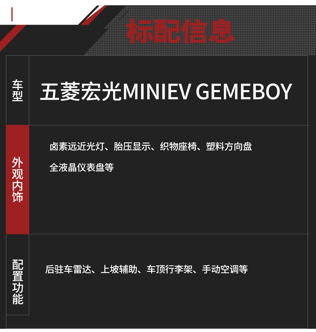 动力系统方面,五菱宏光MINIEV GAMEBOY搭载了一款最大功率为41马力、峰值扭矩达到110牛·米的驱动电机。与其匹配的是磷酸铁锂电池,并根据车型的不同提供分别为200公里与300公里两种续航版本,足以满足日常短途代步需求。