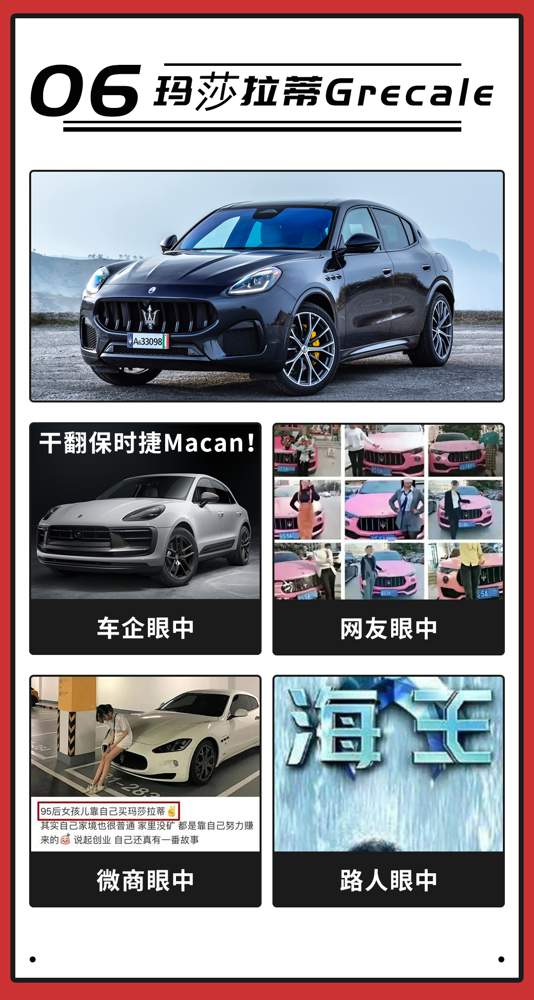 第六款是玛莎拉蒂Grecale,这是玛莎拉蒂基于Giorgio平下全新打造的一款中型SUV,定位在Levante之下,直接竞争对手毫无疑问为保时捷Macan。从MC20到Grecale,可以看出玛莎拉蒂将不再躺平,而是想着如何像保时捷一样赚大钱。