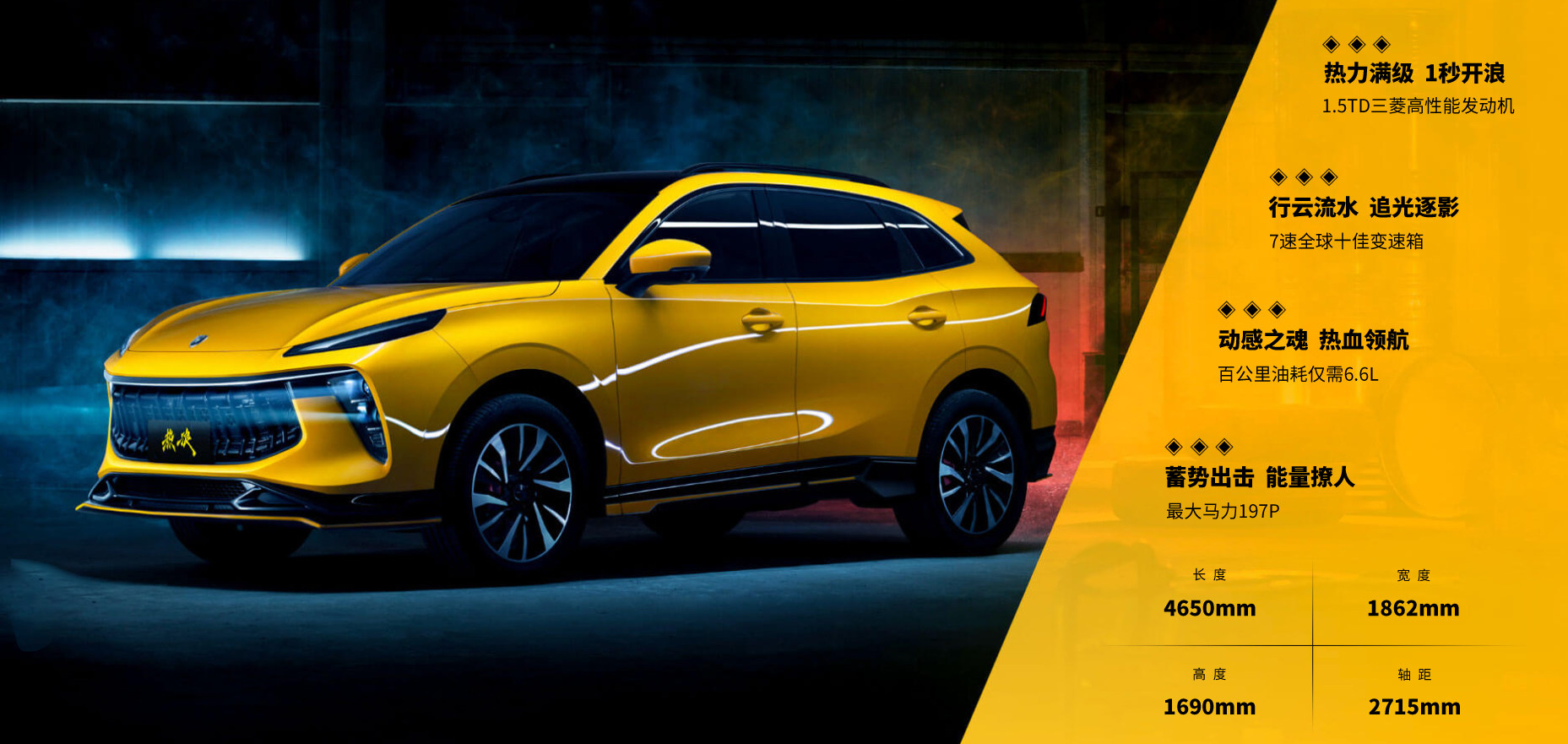 此次新车型的动力倒是没有发生任何变化,热浪版搭载和旧款车型一样的动力总成,基于超级立方EMA架构打造,搭载1.5T直四发动机匹配7速湿式双离合变速器,最大功率为145Kw最大马力197匹,峰值扭矩为285N·m,官方零百加速成绩为9.5秒,每百公里油耗为6.6L。