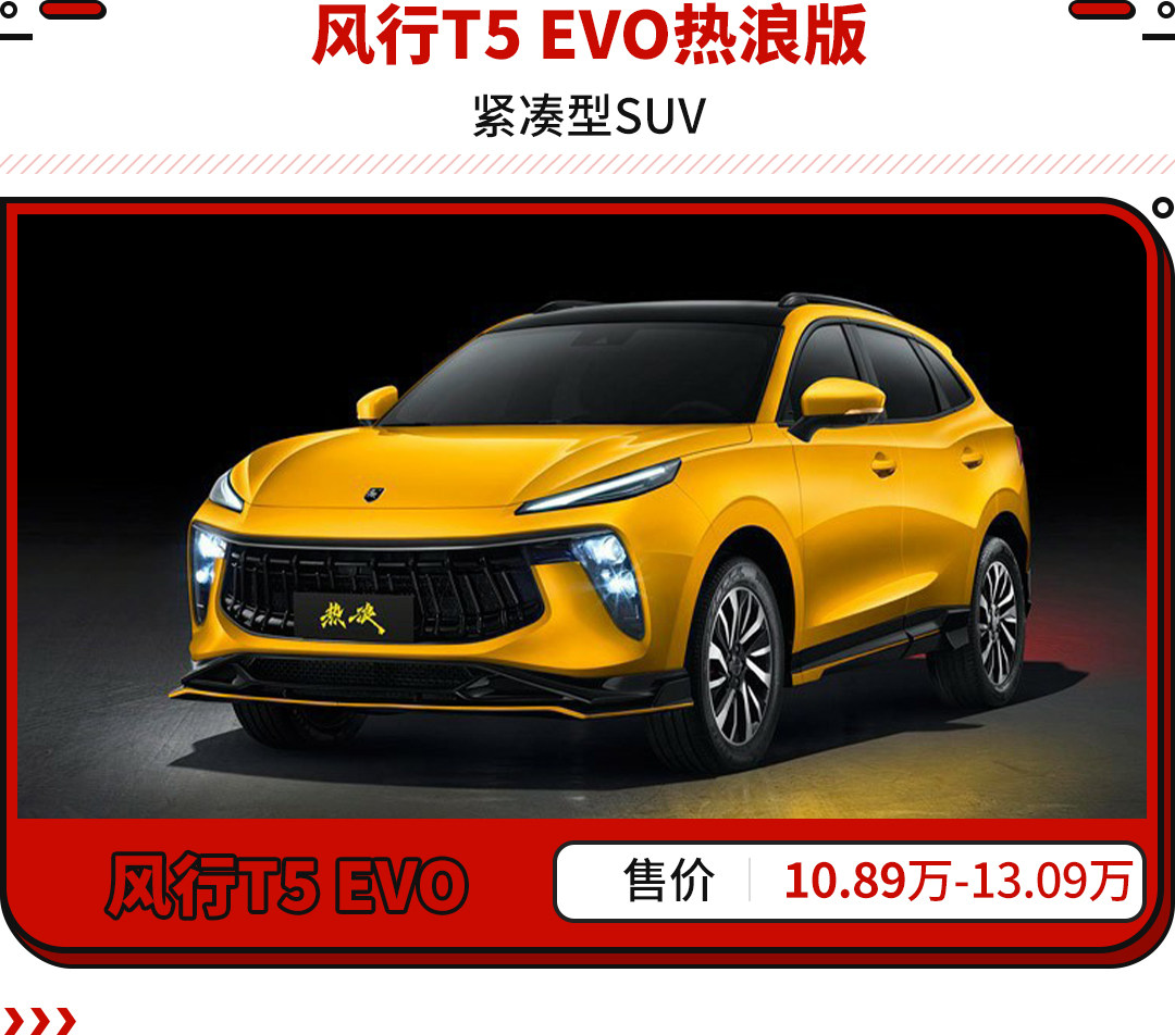 风行T5 EVO车型自21年上市以来一直有着稳定的销量,时隔一年多也迎来了改款车型。东风风行官方公布消息表示,风行T5 EVO热浪版车型将在今日上市销售。风行T5 EVO热浪版属于中期改款车型,整体设计相较于旧款车型的差异不会太大,将会采用全新的热浪黄色车漆,并对细节部分作出了调整,车型配置由此前的五款减为了三款,共推出铂金版、钻石版和星耀版三个配置车型,售价区间为10.89万元-13.09万元。
