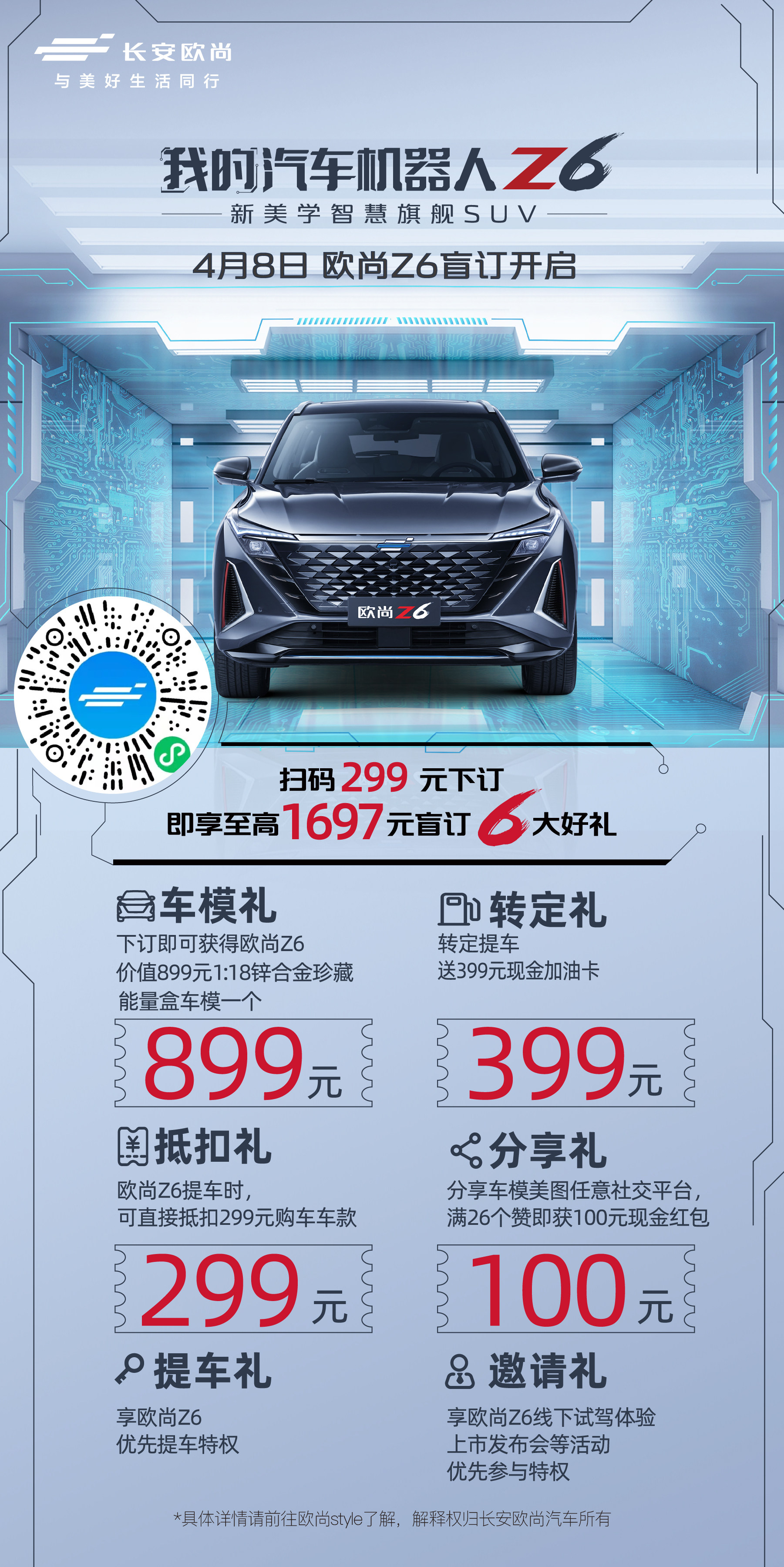 直播间内,欧尚汽车董事长何朝兵亲自现身带货,并带来现金、加油卡、提车款等六大福利。299元下订,即享至高1697元盲订6大好礼,车模礼:价值899元欧尚Z6的1:18锌合金珍藏能量盒车模;转定礼:399元转定提车现金加油卡;抵扣礼:299元欧尚Z6提车抵扣款;分享礼:分享车模美图任意社交平台满26个赞即获得100元现金红包;提车礼:欧尚Z6优先提车特权;邀请礼:欧尚Z6线上线下活动优先参与;如此超值的盲订活动,前往欧尚StyleAPP或欧尚汽车抖音、快手官方账号尽快抢购。
