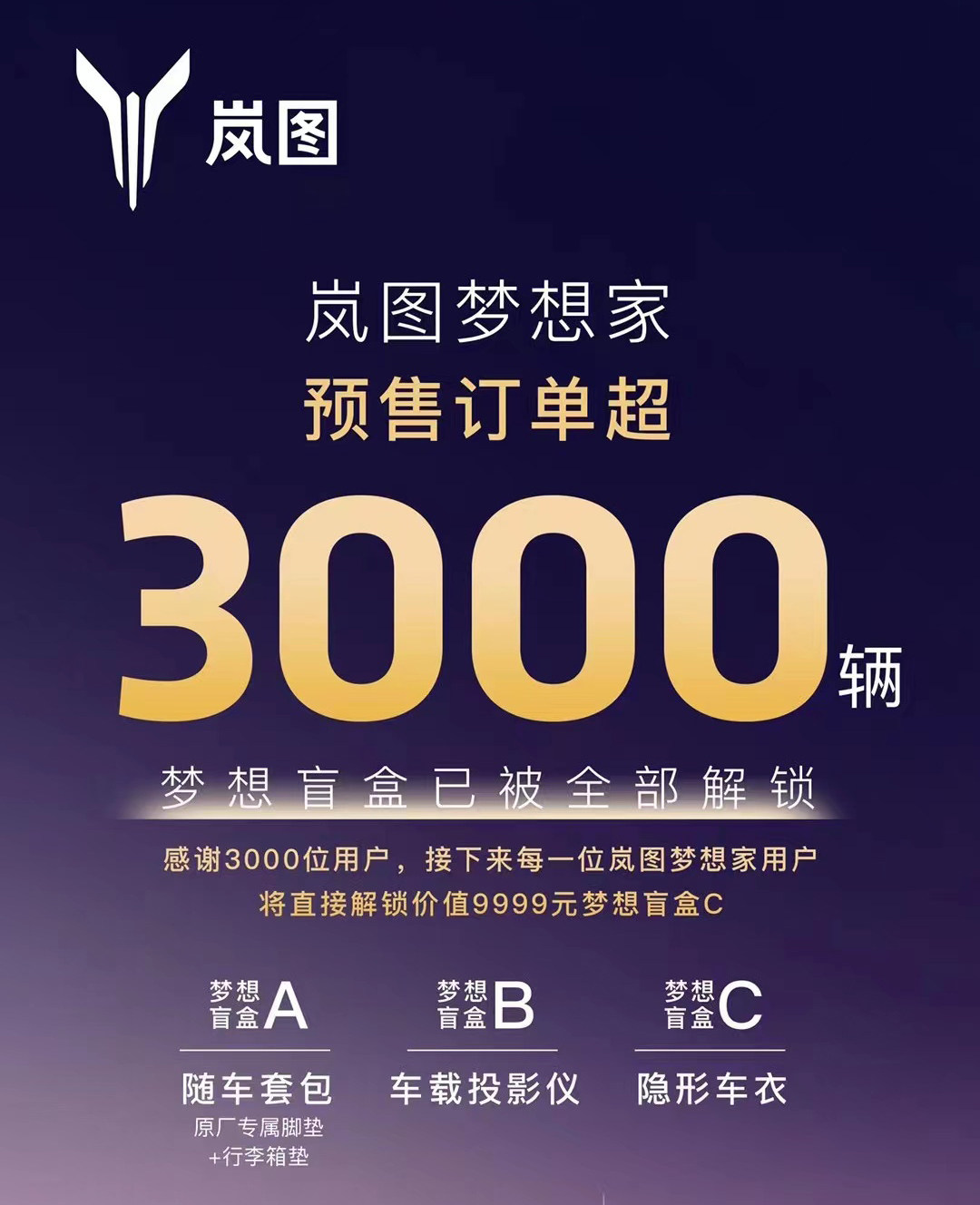 在7日预定开启30分钟,岚图梦想家预定量已超1000台,10日预定量已超3000台。