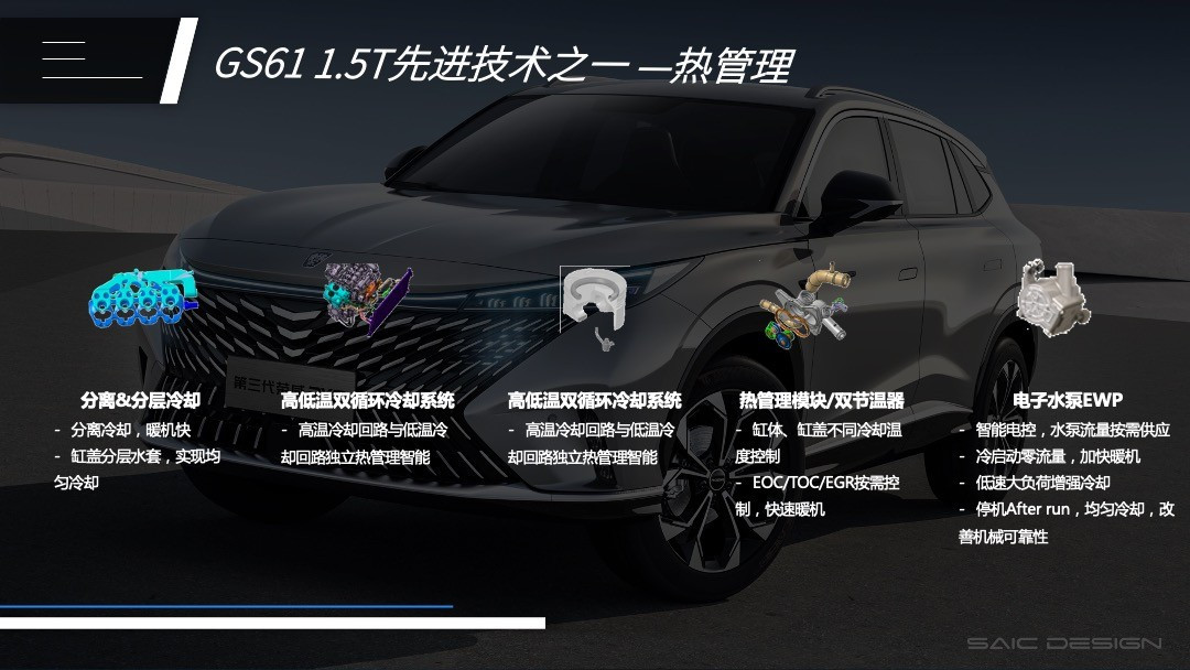 上汽蓝芯GS61发动机配备了高低温双循环冷却系统、热管理模块/双节温器和电子水泵EWP等技术,覆盖各种驾驶场景下的热管理需求。这不仅显著改善了冷启动排放和暖机速率,还能带来更好的经济性。