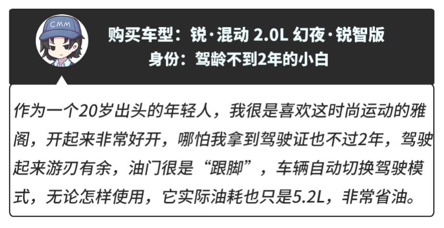 因为它搭载2.0L i-MMD混动系统,综合最大功率达到了158千瓦,性能已经达到了2.0T的表现,作为一套“高阶动力”在朋友面前有足够的谈资。它性能强的同时,还有极低油耗。实测油耗在5L/百公里上下,并且不挑食,92号汽油就能满足它,