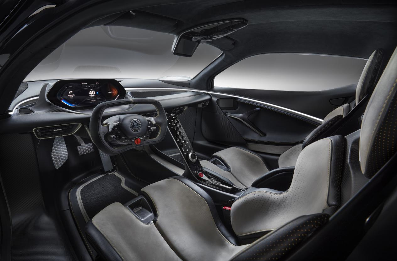除此之外,路特斯还将更多赛车工程技术应用到了Evija身上。“浮动翼”式仪表台兼具美感和优雅,集成了液晶仪表、空调通风装置等,还为内部结构提供支撑作用。方向盘的设计类似于勒芒LMP组或F1赛车风格,进一步强化了Evija的高性能超跑特性。方向盘采用了Alcantara面料包覆,并可定制真皮材质。方向盘上的按钮分布直观简洁,包含电话、定速巡航和DRS尾翼装置调控在内的功能控制。优雅的碳纤维赛道座椅采用纯手工打造,座椅面料同样为Alcantara材质。标配三点式安全带,并可选配四点式安全带,时刻提醒车主这是一台可以随时下赛道的性能利器。