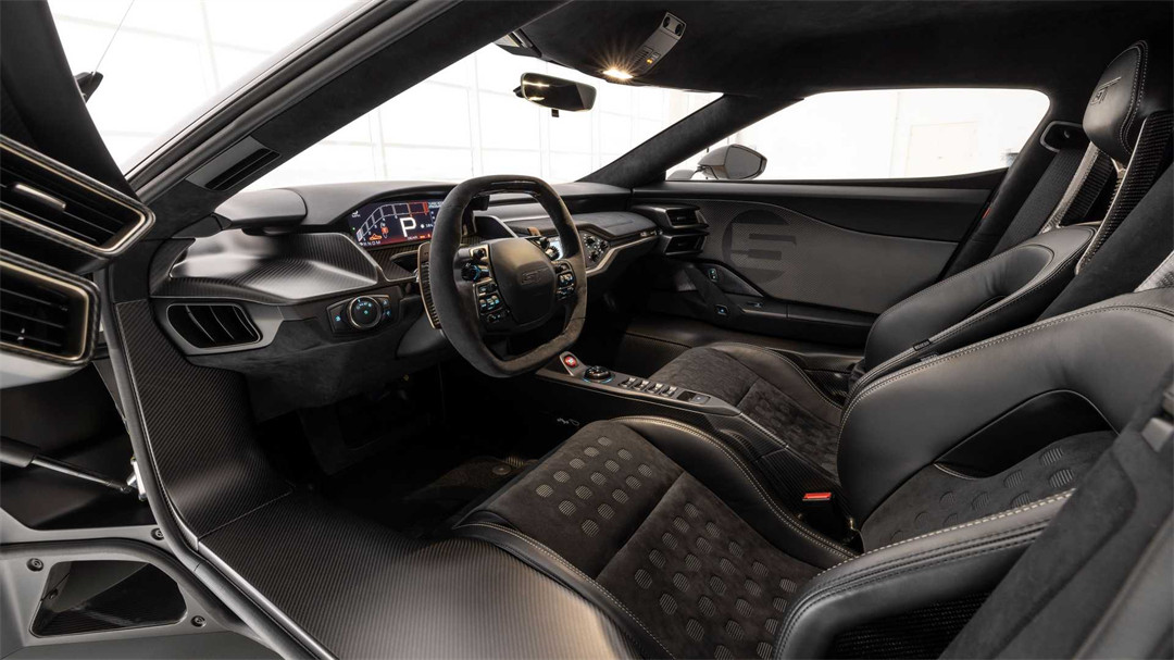 内饰方面,同样地新车的内饰布局也与普通版本福特GT保持高度一致,车内以黑色为主色调,配备两幅式方向盘以及层次感分明的中控台设计。