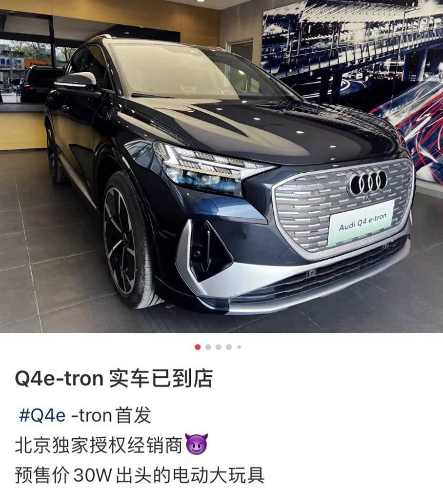 作为奥迪品牌电气化的新品,想必消费者都很关心它的售价,结合此前信息以及日前经销商放出的预定海报图,可以大概得知奥迪Q4 e-tron起售价在30万出头。虽然目前还没有正式官宣,但这曝光的起售价是八九不离十了。