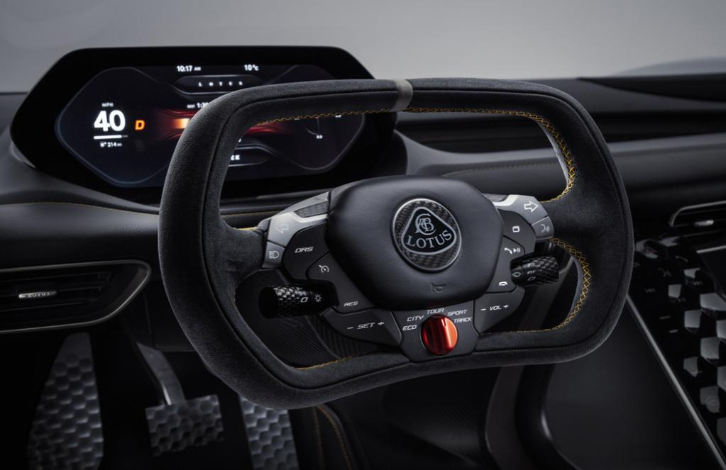 除了设计语言、三电系统和车体材质之外,路特斯纯电超跑架构的另一个重要体现便是智能配置。以驾驶者为中心,Evija的方向盘设计取材于勒芒LMP组或F1赛车风格,底部的中央位置可以选择Range长里程、City城市、Tour巡航、Sport 运动和Track赛道五种驾驶模式;方向盘前方是数字显示屏,是车内唯一一块屏幕,集中显示所有必要的信息,简洁凝练;其他控制装置位于悬浮中控台上,中控台具有触觉反馈的感应按钮,按钮组采用蜂窝状设计,每个按钮都位于六角形凹槽中,极富科幻色彩。此外,用户可以通过Apple CarPlay或Android Auto将智能手机与车辆无缝连接,访问音乐和导航服务等功能。