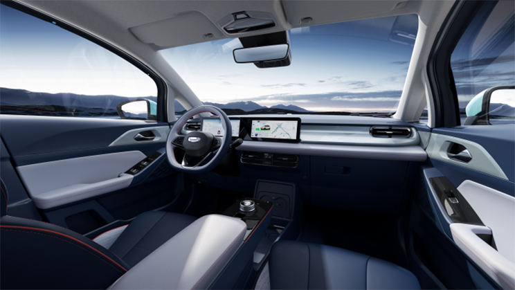 和外观一样,内饰也是相当简洁,这也符合当下新能源车内饰的特点。10.25英寸的悬浮式全液晶双联屏,内置银河OS。整车几乎没有什么实体按键,换挡机构也改为旋钮式。这也表示,大部分操作和功能都将通过语音和中控屏来控制。