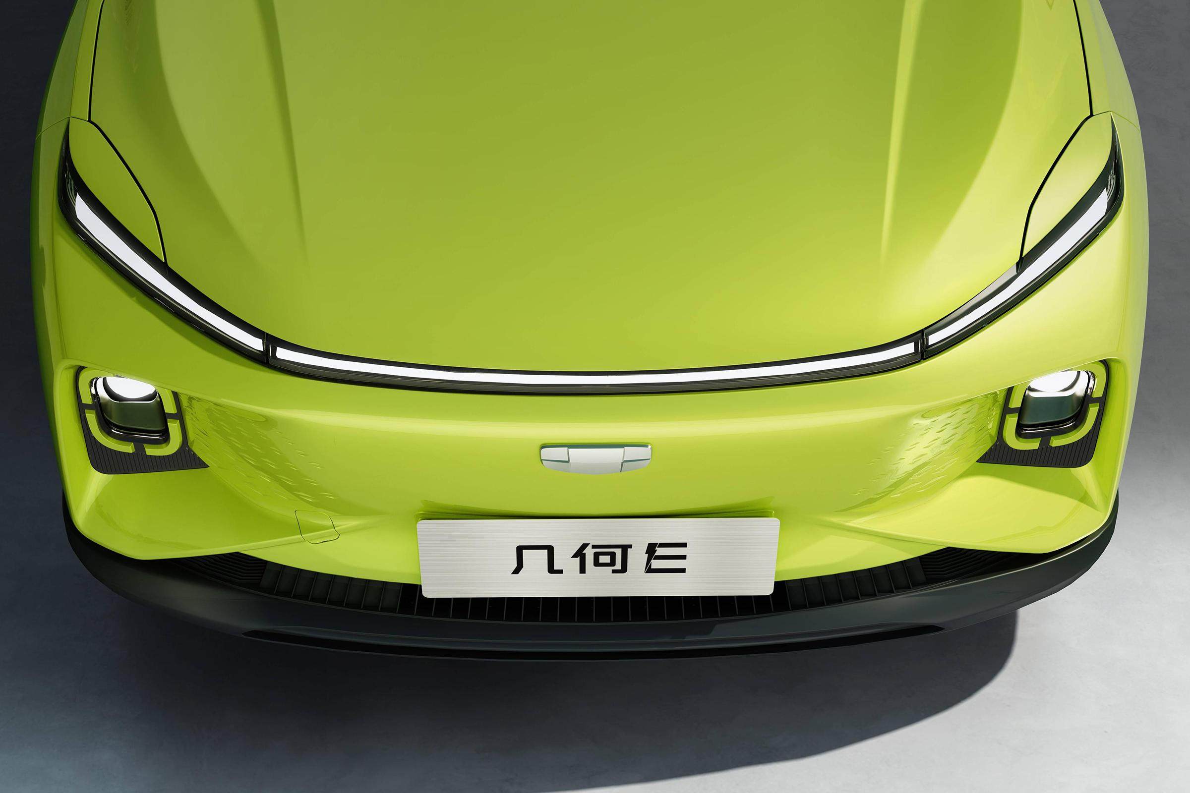 在几何E身上,集合了许多的电气化元素,前脸设计十分简洁。封闭式格栅、发光LOGO、绿色分体式大灯加上贯穿式灯带就组成了一个前脸。绿色的分体式大灯十分出戏,莫名像一对小眼睛。倒不是说不好看,只是感觉换成与车身同色的颜色似乎会更和谐些。