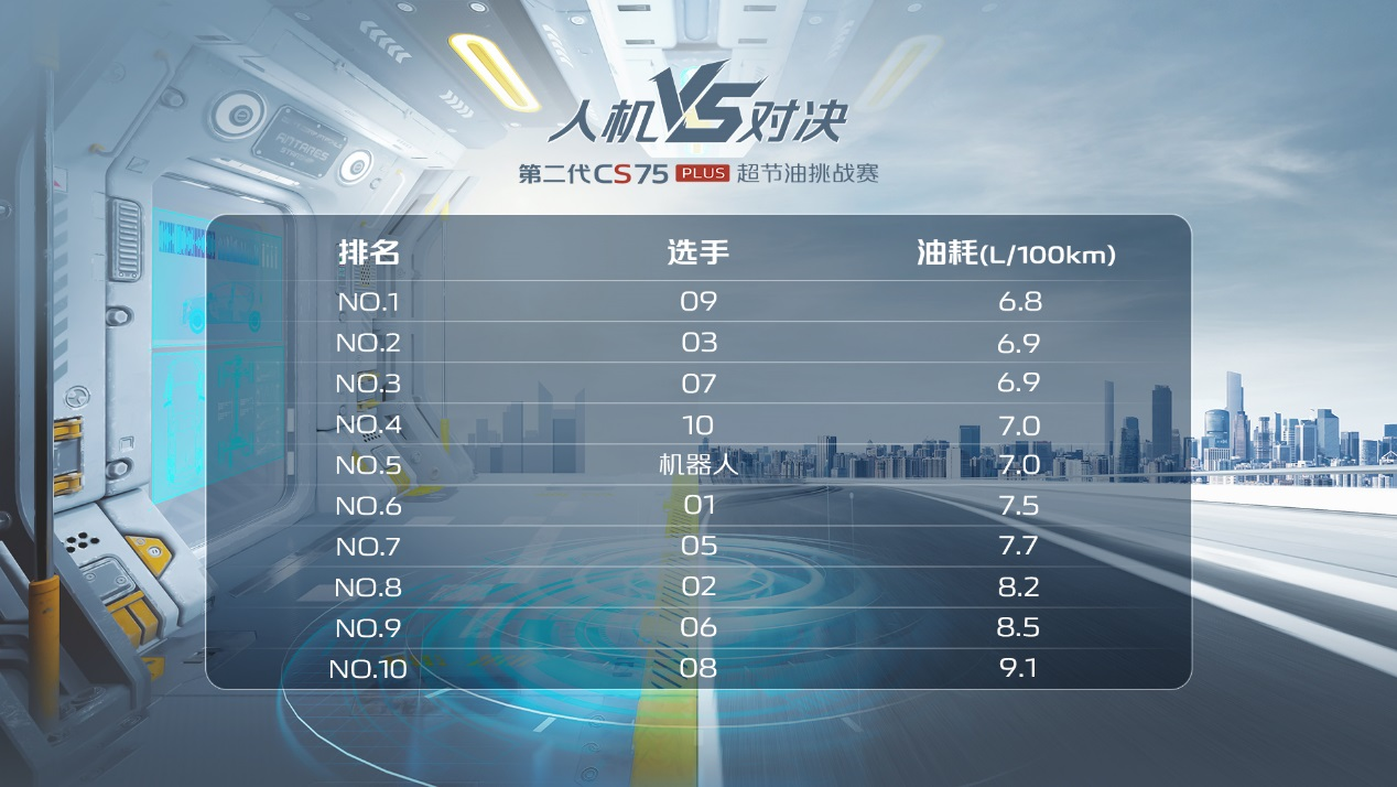 随着路况实测小组抵达终点,挑战赛也揭晓了最终成绩。在全网直播镜头的见证下,“室内滚轴测试场”由机器人选手驾驶的第二代CS75PLUS交出百公里油耗低至7.0L的成绩。来自路况实测组的09号车则以百公里最低油耗6.8L的惊艳成绩,一举夺得此次“#苛刻挑战#人机对决——第二代CS75PLUS超节油挑战赛”的冠军!