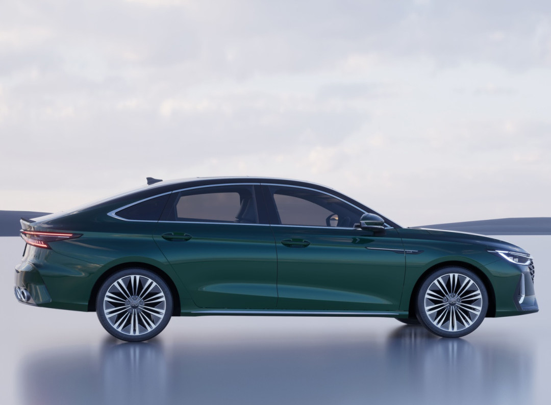 车身侧面,新车采用了标准的溜背式造型,搭配修长的多段腰线和大尺寸多辐式轮毂造型,呈现出非常不俗的运动气息。