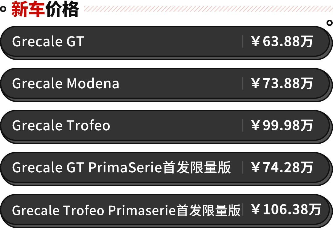 新车提供入门级GT版、中配Modena版和高性能Trofeo版3款车型。另有两款专属独特配置的PrimaSerie首发限量版,而纯电版Folgore将在后期推出。