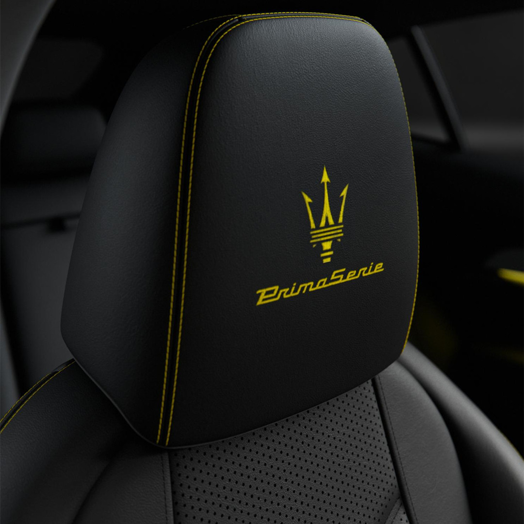 PrimaSerie的头枕带缝线首发限量版标识,GT PrimaSerie有Bianco Astro(皓空白)搭配红色刹车卡钳、Blu lntenso(深海蓝)搭配黄色刹车卡钳可选。