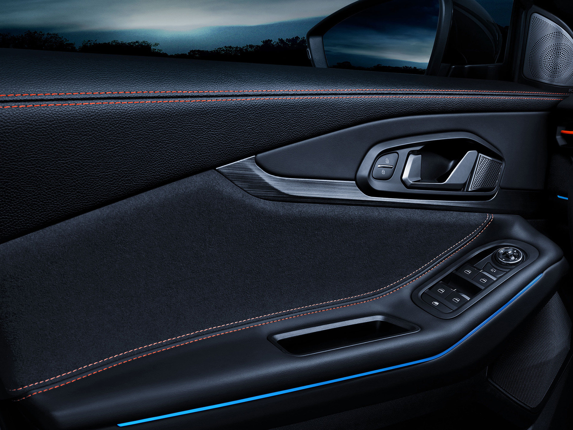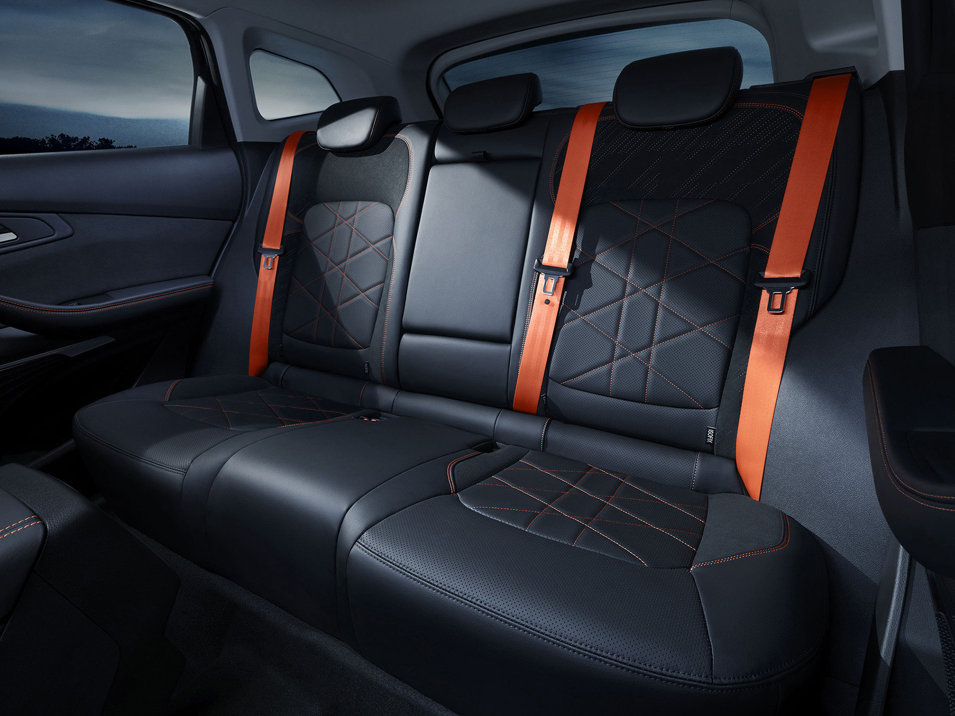 内饰布局上则继续使用双联屏+液晶空调面板的搭配,科技范儿的冲击也符合当下审美潮流。不过竟然主打运动属性,自然也少不了运动装饰件的点缀,可以看出车内增加了鲜橙色的缝线、安全带、饰条等,披着的氛围感绝对不俗。