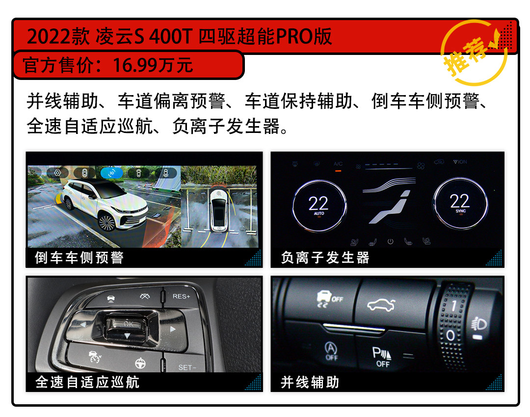 在价格层面来看,虽然入门的凌云S 400T 两驱超能PRO版相比凌云S 400T 四驱超能PRO版整体贵出了1万元,但是能够换来L2级的驾驶辅助系统,包括全速自适应巡航、并线辅助、车道偏离预警系统、道路交通标识识别等。
