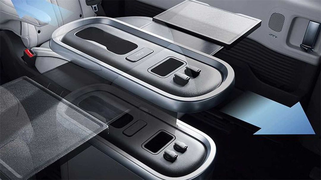 新车为第二排位置分别配备了一种独立的商务座椅,并配有尊贵的航空头枕、可调节扶手以及腿托、储物台等。