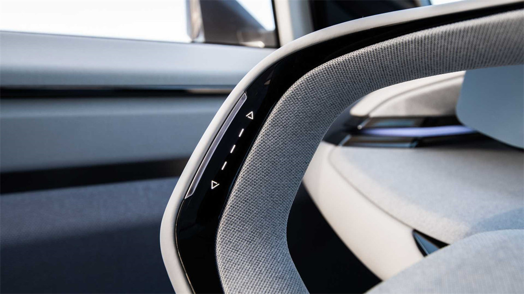 与此同时,内饰还遵循无实体按钮设计,所有功能性按钮均采用触控按键,做到极致的简约。其极简的设计理念从方向盘处即可体现,采用了独特的单幅式方向盘设计,功能性按钮均集成在方向盘的边框处,不知道量产之后是否真的会如此极致,就感觉误触的几率变得更大了。