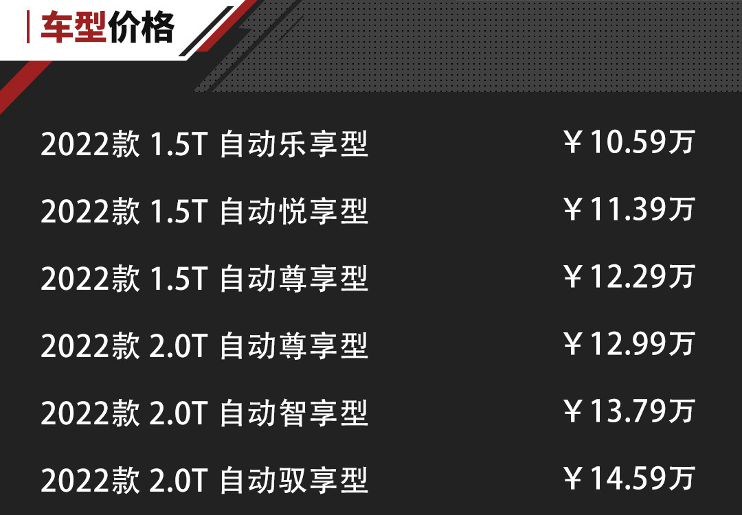 目前共推出了6款车型,其中3款为1.5T动力,3款为2.0T动力,首先看一下入门的1.5T动力版本,其实除了顶配车型以外,其他版本的配置都整体偏低,而且需要注意,在2022款 1.5T 自动尊享型以下,均是仅配后扭力梁式非独立悬架,只有该版本才开始配多连杆式独立悬架,底盘舒适性也会变得更加从容。