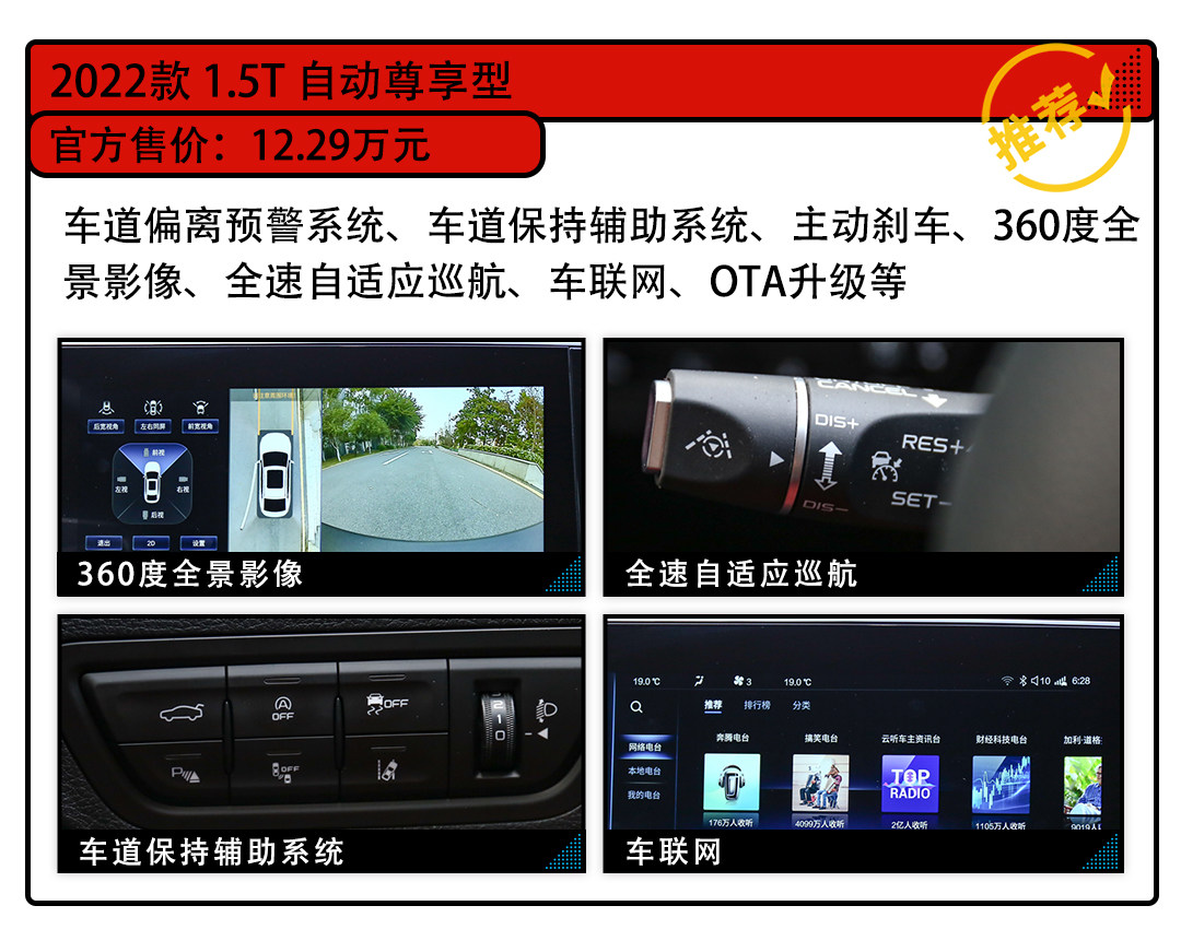 同时配置还有车道偏离预警系统、车道保持辅助系统、主动刹车、360度全景影像、全速自适应巡航、车联网、OTA升级、自适应远近光等,一系列高阶智能化功能加持,能够带来更加便捷的用车体验,所以综合来看,在1.5T动力版本教授更推荐2022款 1.5T 自动尊享型,起码这些配置已经达到越级体验。