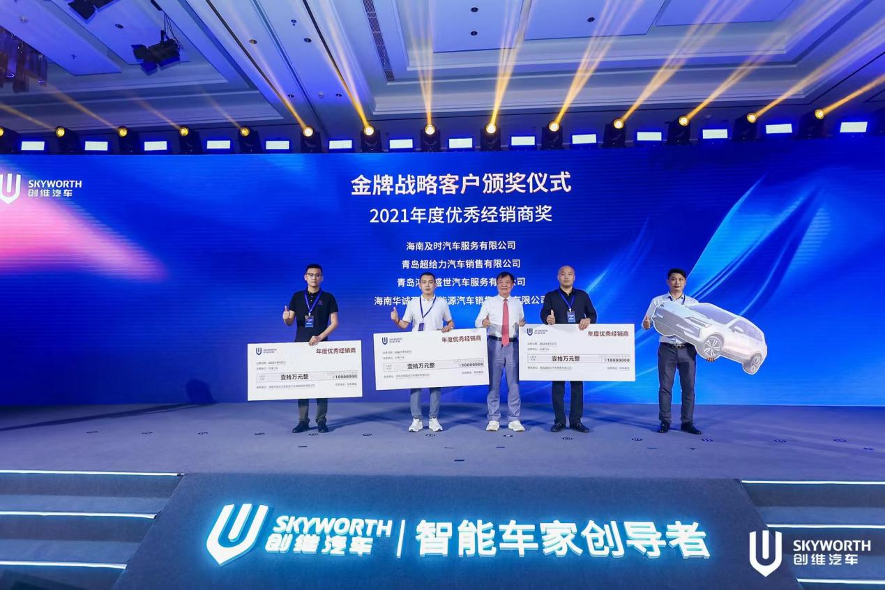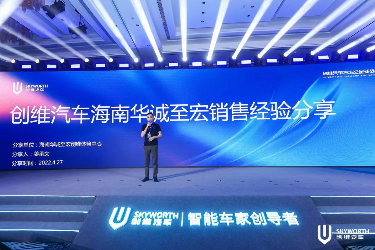 厂商紧密合作是创维汽车达成宏伟目标的重要助力。为嘉奖典范,本次大会由黄宏生先生等创维集团领导人对优秀经销商进行三轮颁奖,并邀请海南华诚至宏新能源汽车销售服务有限公司总经理姜承文等优秀经销商代表进行致辞。