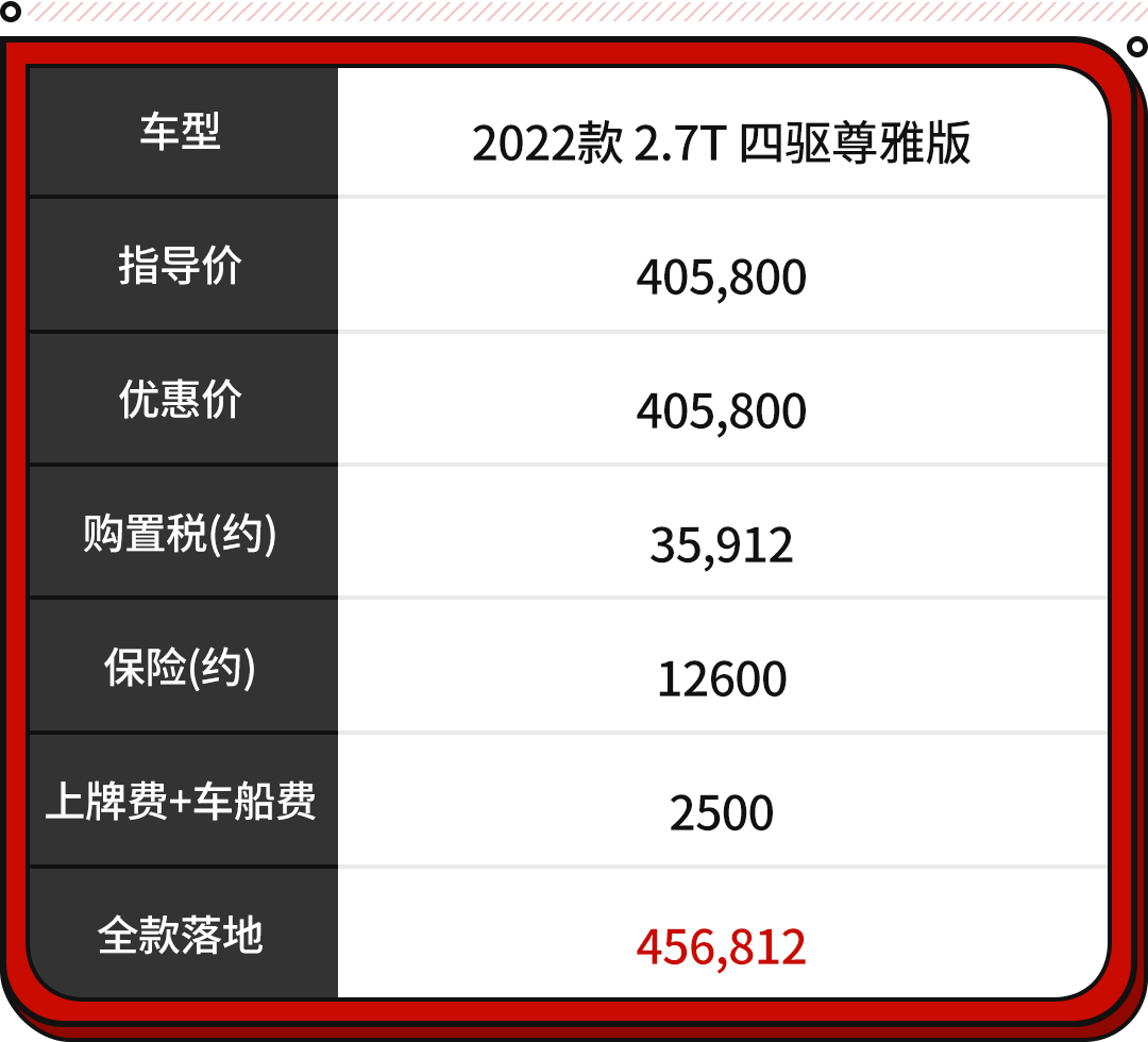 作为参考,现款车型中搭载2.7T发动机只有四驱尊耀版和四驱总统版两款车型,售价分别为41.88万和47.88万。