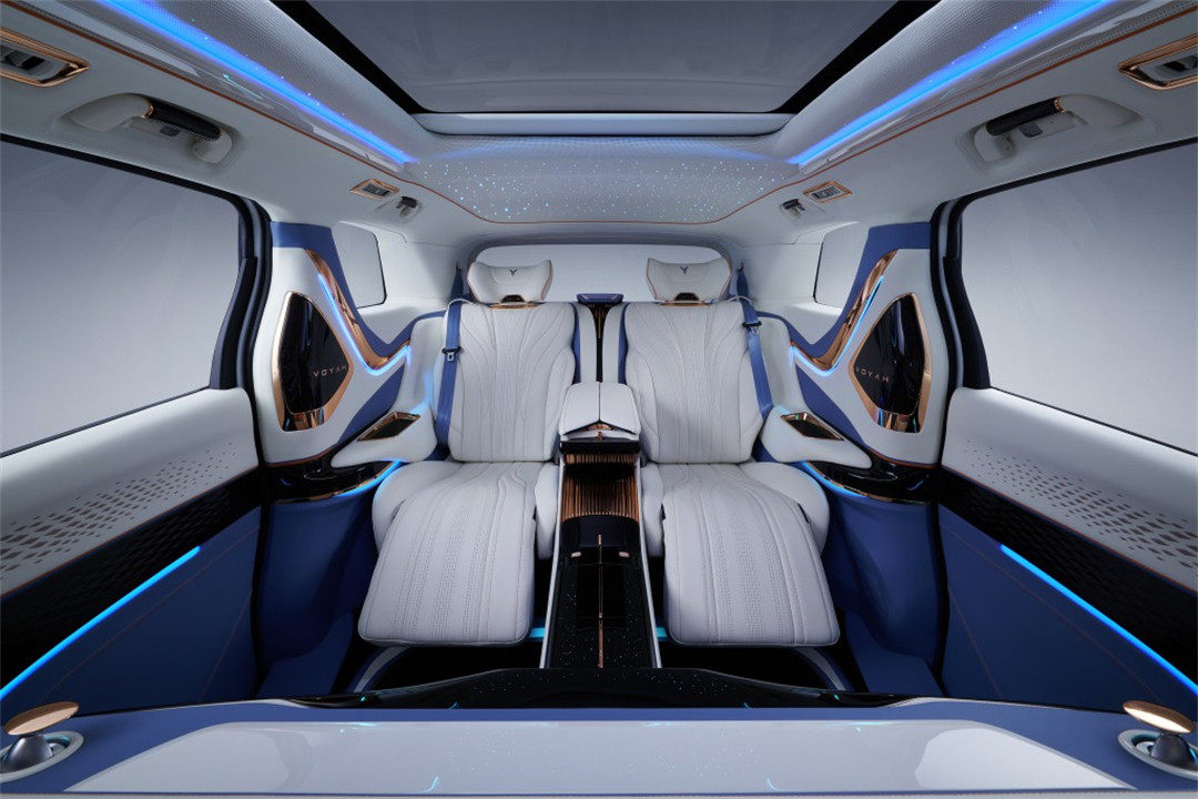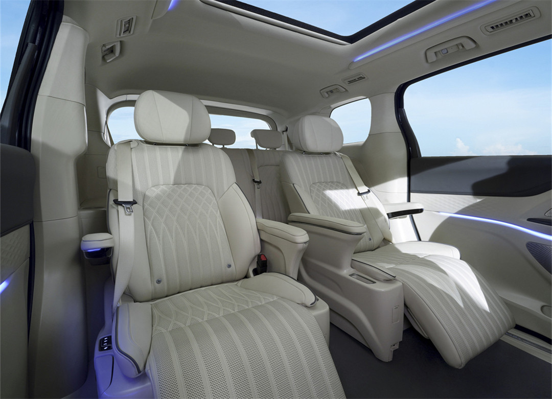 内饰用料更加豪华,细节设计精致,座椅为4座布局,后排的一体式航空座椅配备了睡眠头枕、独立智控扶手屏、旗舰车载冰箱等,门柱上的饰板有专属Logo,地板为木质材质。