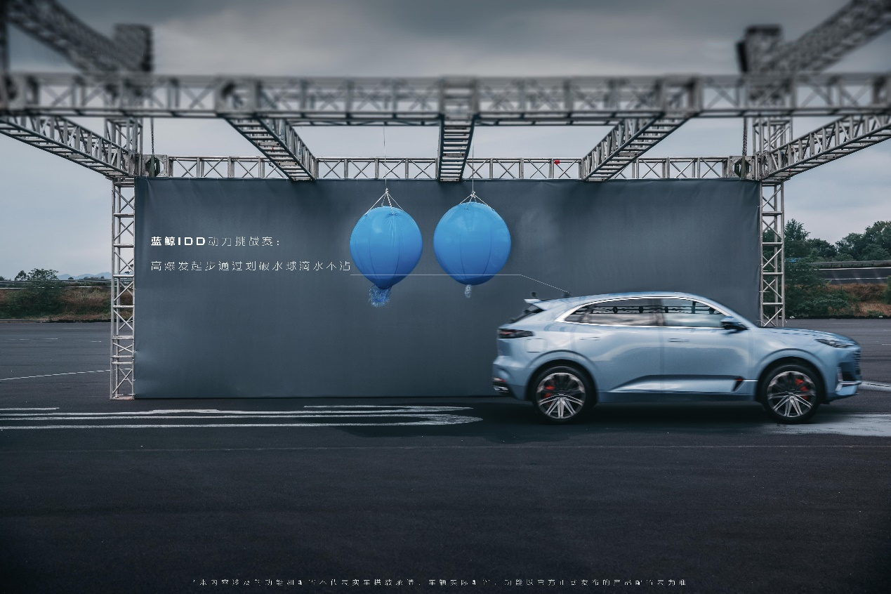 #鲸心动魄——蓝鲸iDD挑战自由落地#挑战规则为车辆在倒悬的水球前由静止状态满油起步,车顶的锋利物会在车辆通过的瞬间划破水球,如气球中的水没有大量浇注在车身上,即为挑战成功。此项挑战考验蓝鲸iDD起步的极速响应和强劲动力。