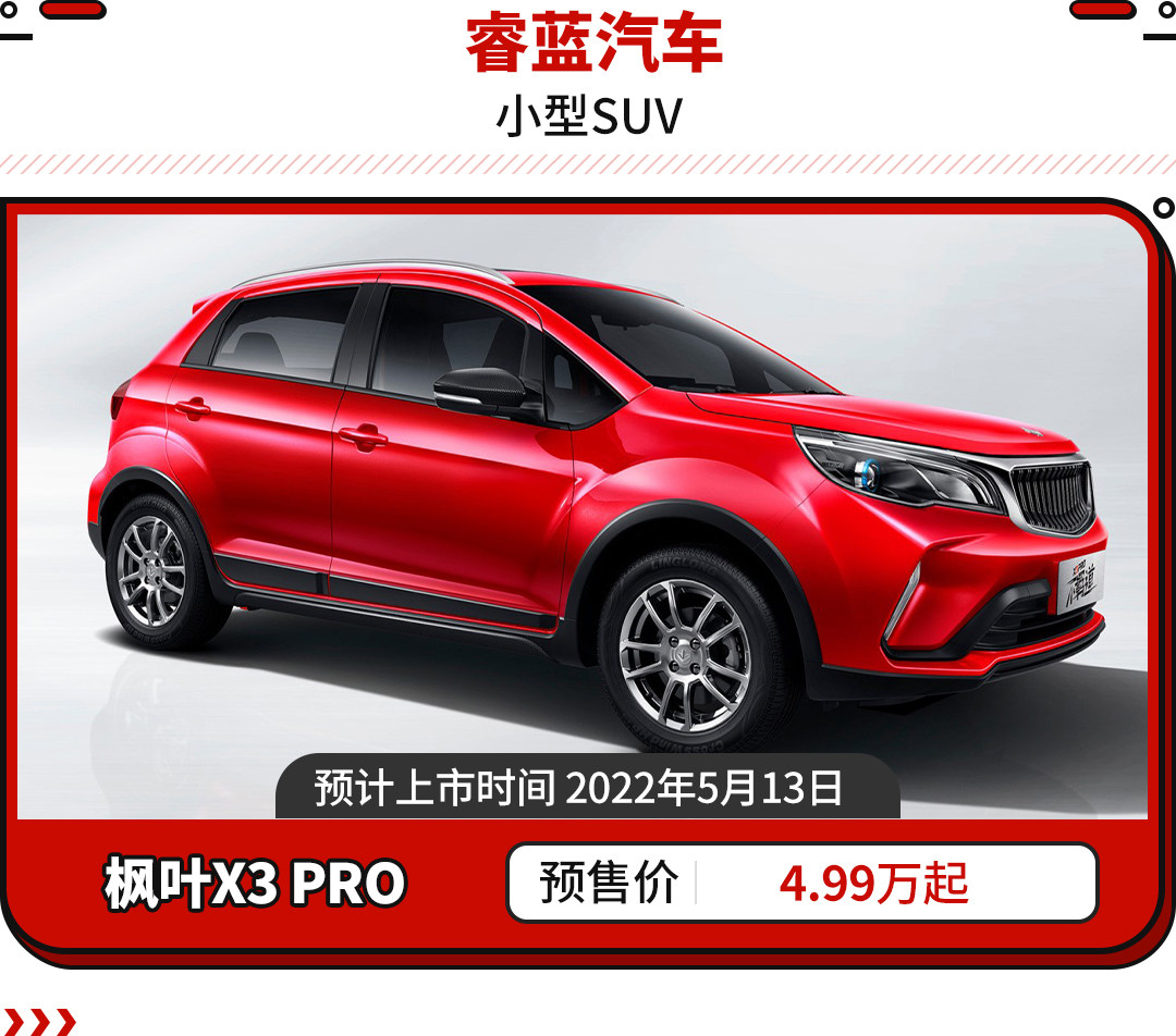 那就是睿蓝汽车旗下的枫叶X3 PRO,新车型定位为小型SUV,将于5月13日正式上市,预售价也已经公布,最低配车型的预售价为4.99万元,将会提供3款不同配置的车型。同时,这也是睿蓝汽车的第一台燃油车型。