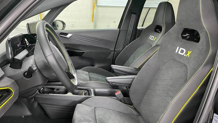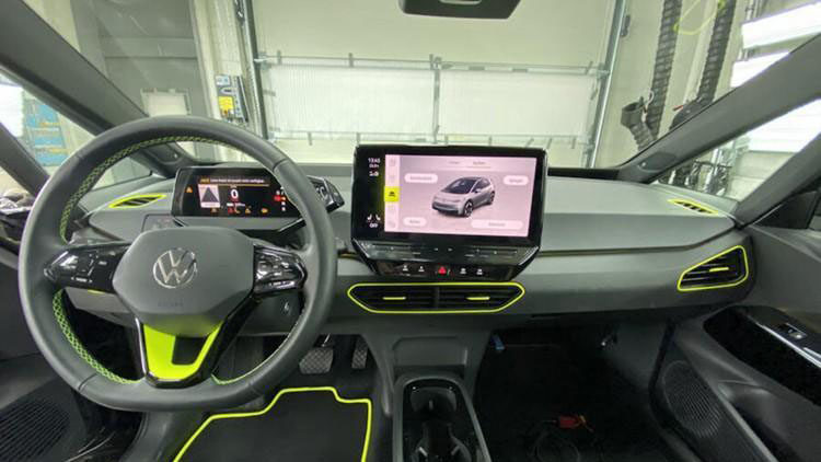内饰部分和外观相呼应,和现款ID.3的设计十分相似,不过在出风口,方向盘和座椅等位置都加入了荧光绿的装饰点缀,而且配备了运动型座椅,采用了Alcantara材质。